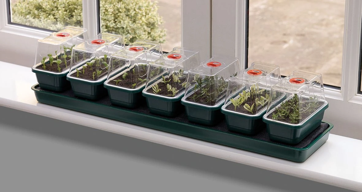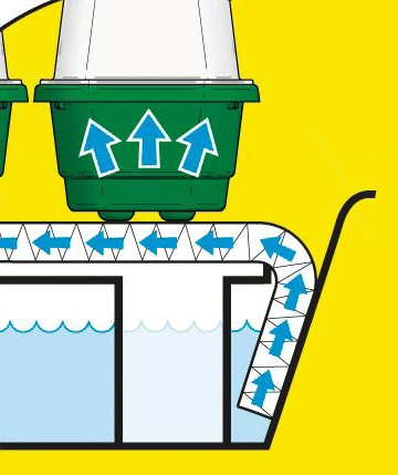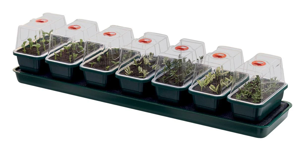 Der Super 7 ist ideal für die Fensterbank und enthält 7 belüftete Mini-Gewächshäuser. Die Anzuchtschalen stehen über dem Reservoir auf einer erhöhten Plattform, die mit einer Kapillarmatte bedeckt ist. Die Pflanzen ziehen bei Bedarf auf natürliche Weise Wasser aus der Kapillarmatte. Das Set aus 7 kleinen Anzuchtschalen eignet sich perfekt für die Keimung verschiedener Samen oder die Bewurzelung kleiner Stecklinge in ihrem eigenen Mikroklima. Der Deckel ist mit einer drehbaren Entlüftung ausgestattet, die sich leicht öffnen und schließen lässt. Das ist sehr wichtig, denn für Sämlinge und Stecklinge braucht man eine konstante Luftfeuchtigkeit von etwa 60-80% und eine Temperatur von 20-25°C. Der Boden hat auf zwei Ebenen Löcher. Diese Löcher können für die Drainage oder die Wasseraufnahme genutzt werden. Das Zimmergewächshaus hat einen extra hohen Deckel, damit die Sämlinge und/oder Stecklinge genügend Platz zum Wachsen haben. Das Reservoir kann mit Wasser oder einer Nährlösung Ihrer Wahl gefüllt werden. Die Kapillarmatte saugt die Flüssigkeit auf, oder die Zimmergewächshäuser können sie durch die Öffnungen im Boden an die Pflanzen im Zimmergewächshaus weitergeben. Auf diese Weise nimmt sich jede Pflanze, was sie braucht.