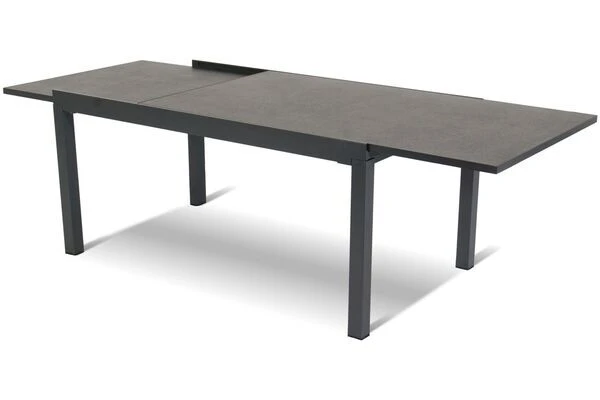Auch wenn es mal turbulenter zugeht, dieser Tisch hält einiges aus. Die unempfindliche steingraue Tischplatte aus stabilem HPL (High Pressure Laminate) ist besonders Kratzfest und leicht zu reinigen. Sollten mal mehr Gäste kommen als erwartet, ziehen Sie die Platte schnell und einfach auf bis zu ca. 260 cm aus. Das stabile Aluminiumgestell sorgt für einen festen Stand und gibt dem Tisch eine hohe Belastbarkeit von bis ca. 50 kg.